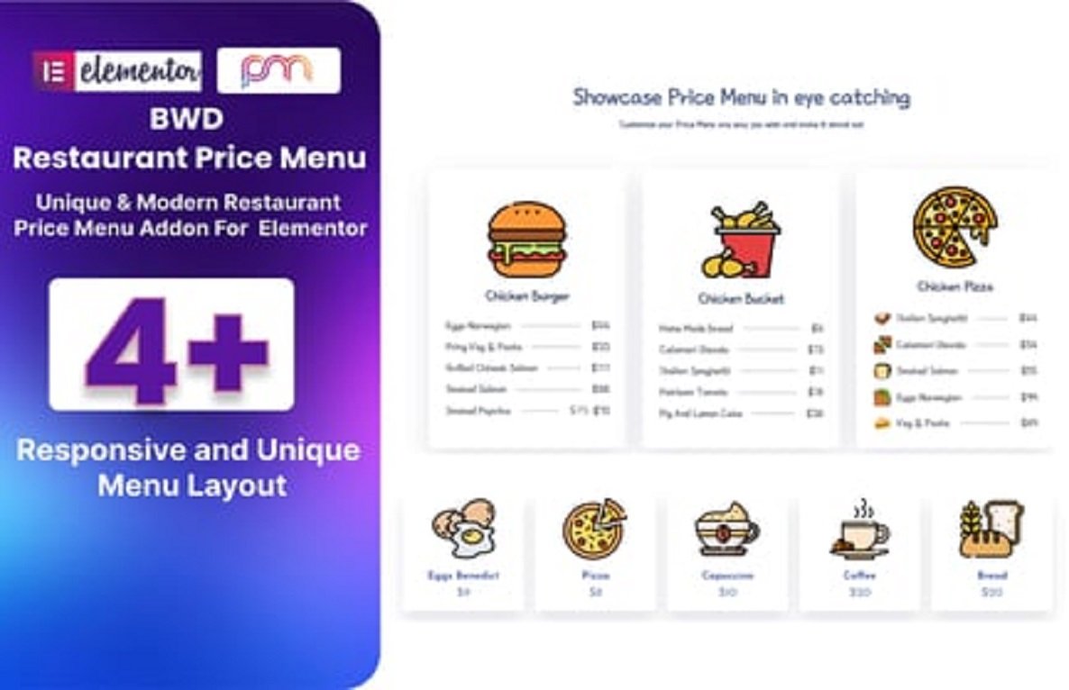 Restaurant Price Menu Addon For Elementor 1.0 is a powerful WordPress plugin designed to showcase your restaurant menu items, prices, and descriptions beautifully. Perfect for cafes, restaurants, bistros, or food delivery websites, it allows you to create elegant and responsive menu layouts that attract and engage visitors.